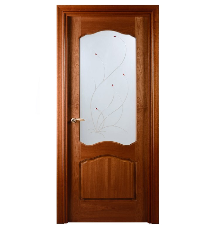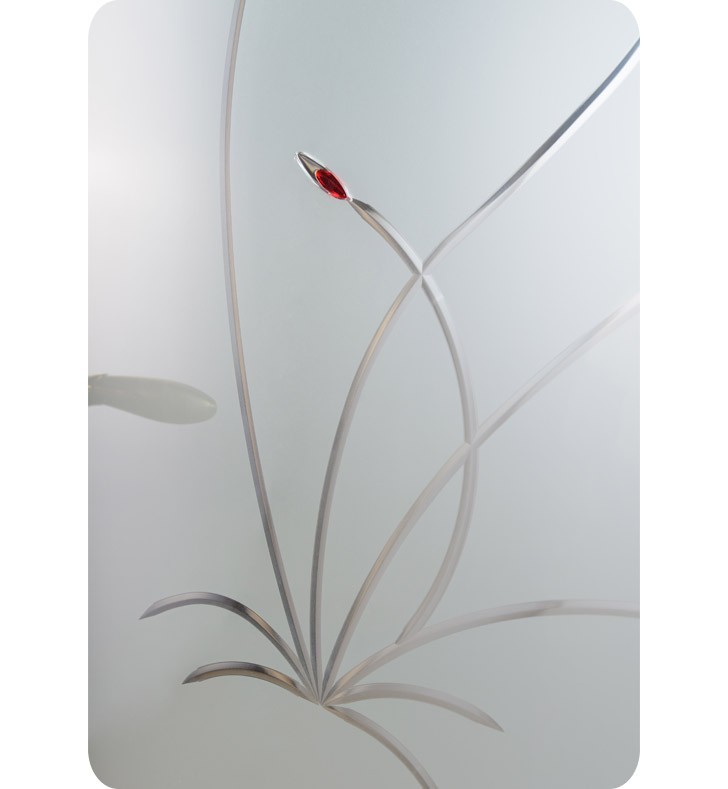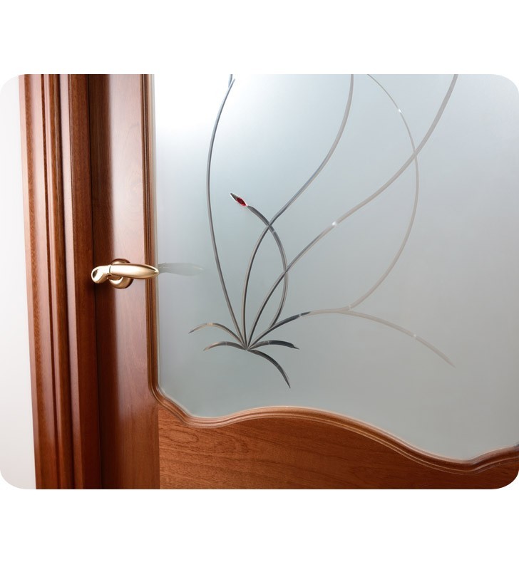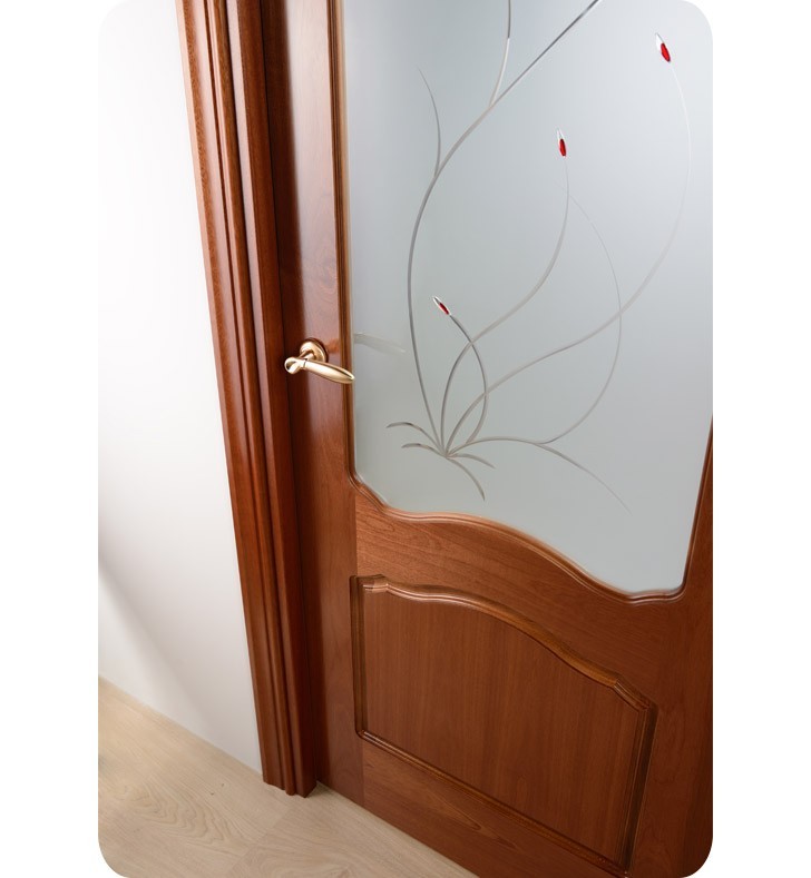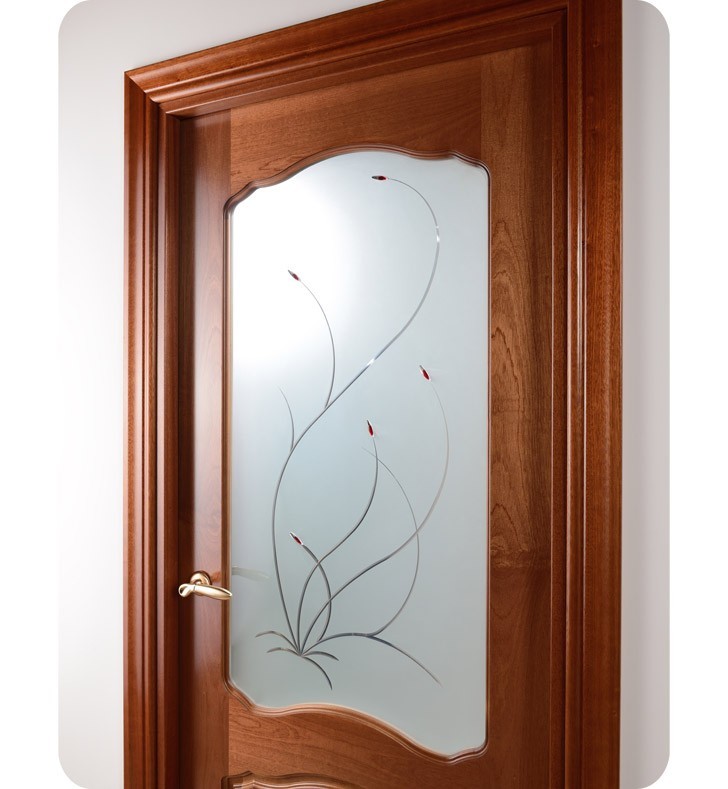"The Desta Verra Interior Door Sapele takes the traditional Desta door and then adds a twist. A portion of the door is frosted glass, but the design is different than other doors with glass inlay because of the glass design. Ruby red glass is fused on top of five willowy grassy blades which are engraved on the tempered glass of the Desta Verra giving it a refined and dramatic look.