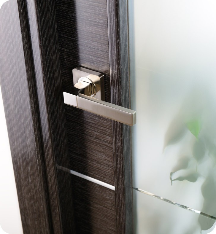 "The Avanti Vetro Interior Door has a horizontal line design that will instantly catch your attention. The black apricot finish is broken up by silver strips which separate the door into five block sections. All five blocks have the veneer flowing to the border creating a sense of running water.