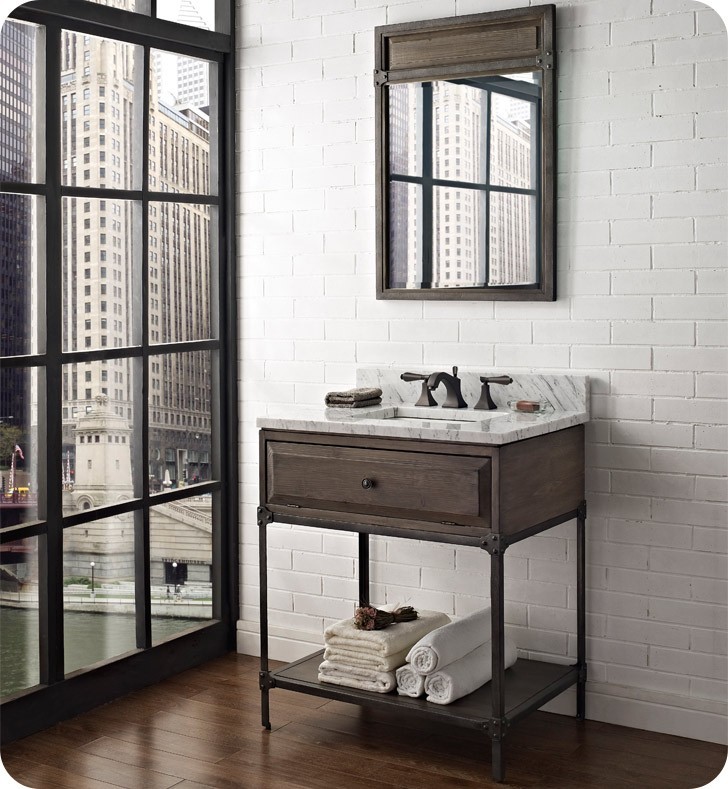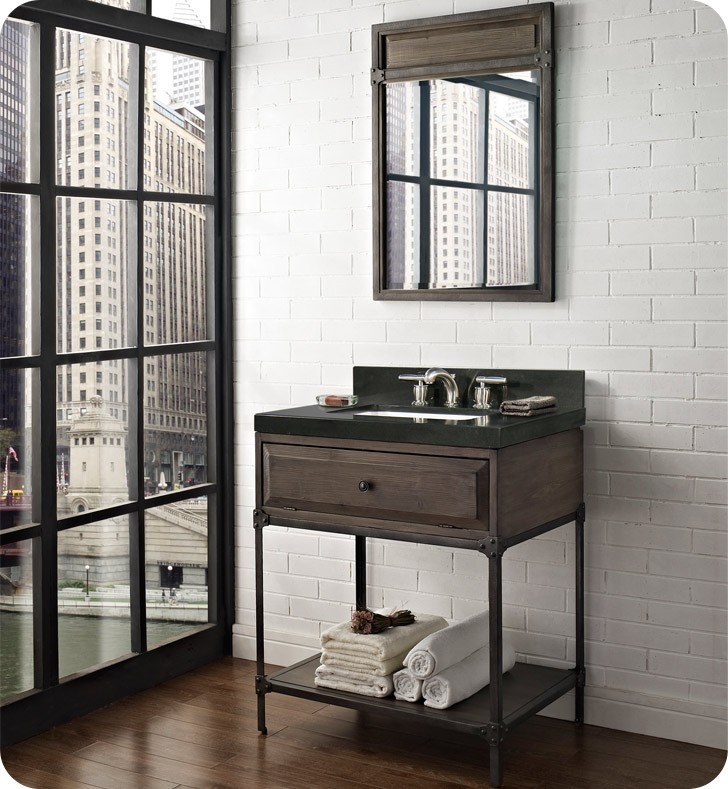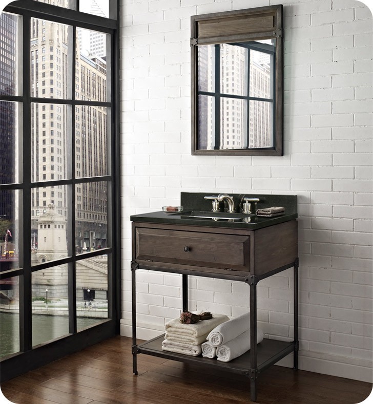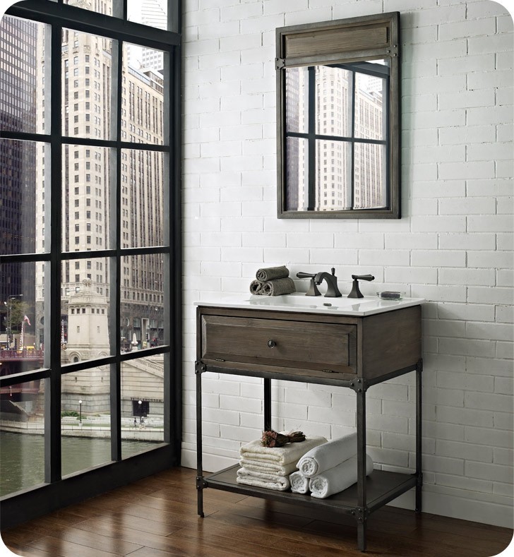 "Toledo blends a clean-lined profile with machine age details in a modern approach to bath décor. Decorative “rivets" on cabinet and mirror provide a chic, cutting edge industrial look. Highlighting the innate beauty of the wood is a sand blasted Driftwood Gray finish, perfectly complemented by Charcoal finished metal framework and antique brass finished hardware."