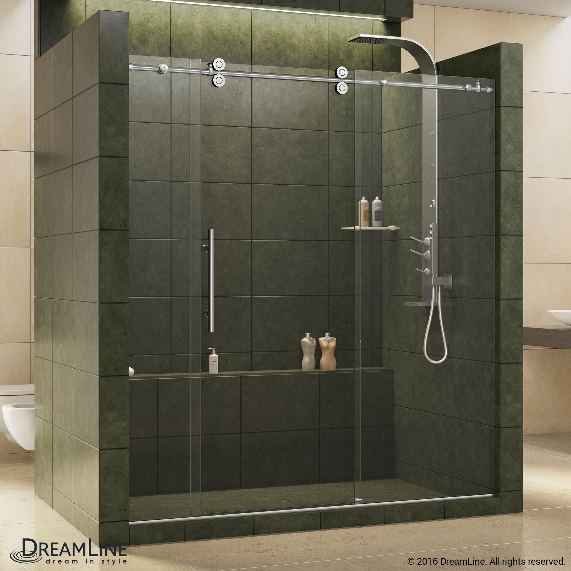 Enigma is a fully frameless sliding shower door or enclosure is stunning with 1/2 in. thick tempered glass and a modern design that delivers elegance and sophistication. The striking stainless steel hardware adds distinguished style and quality to complete the look of luxury in an upscale design. The Enigma glass is treated with DreamLine exclusive ClearMax anti-lime scale glass coating for superior protection and easy maintenance Add an element of indulgence to your bathroom with the Enigma door or enclosure from DreamLine.