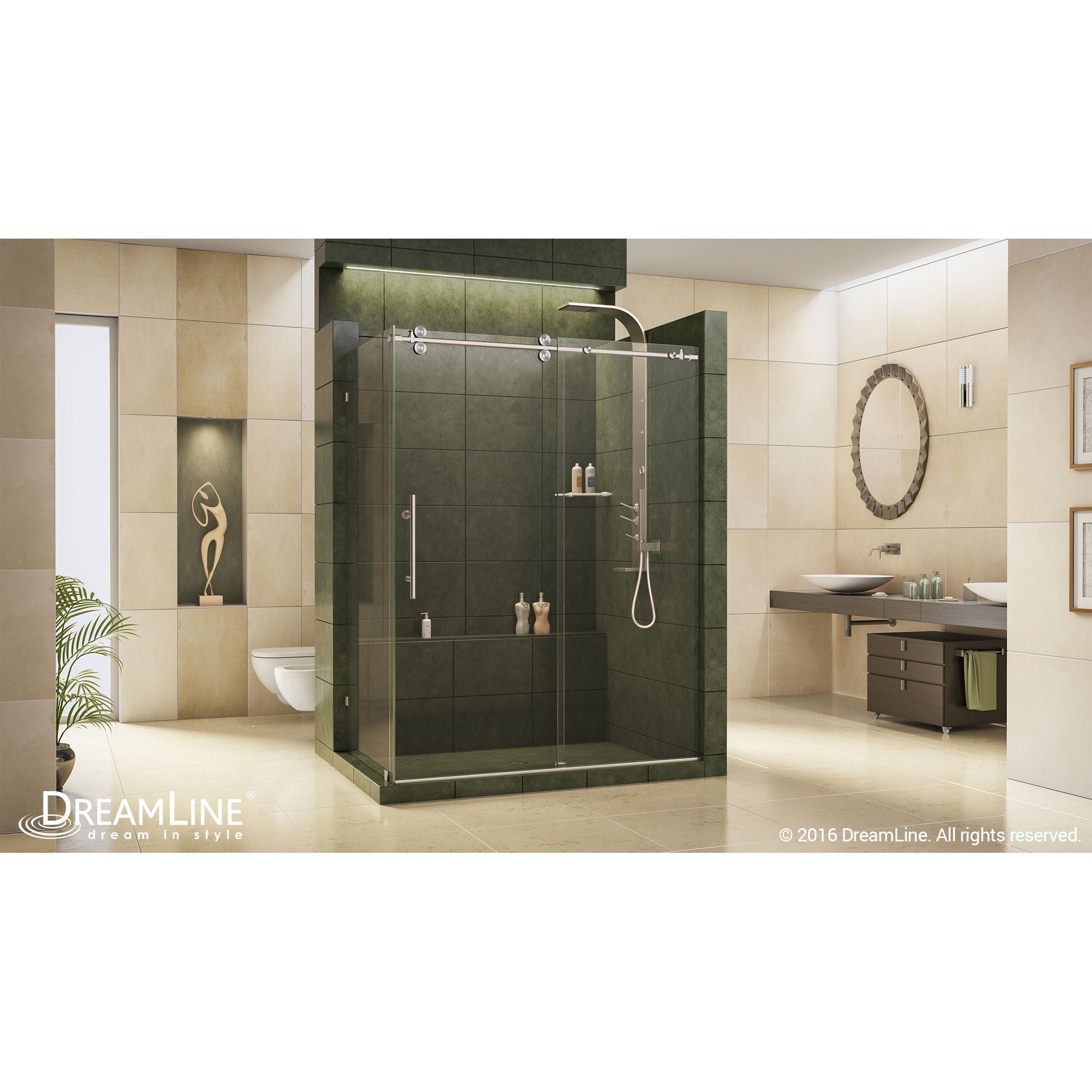Enigma is a fully frameless sliding shower door or enclosure is stunning with 1/2 in. thick tempered glass and a modern design that delivers elegance and sophistication. The striking stainless steel hardware adds distinguished style and quality to complete the look of luxury in an upscale design. The Enigma glass is treated with DreamLine exclusive ClearMax anti-lime scale glass coating for superior protection and easy maintenance Add an element of indulgence to your bathroom with the Enigma door or enclosure from DreamLine.