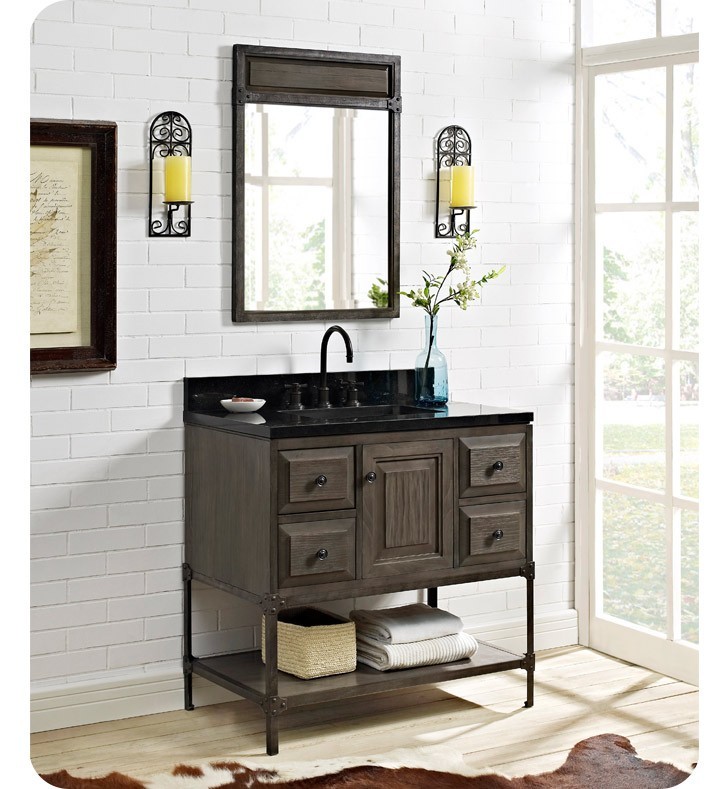 "Toledo blends a clean-lined profile with machine age details in a modern approach to bath décor. Decorative “rivets” on cabinet and mirror provide a chic, cutting edge industrial look. Highlighting the innate beauty of the wood is a sand blasted Driftwood Gray finish, perfectly complemented by Charcoal finished metal framework and antique brass finished hardware.