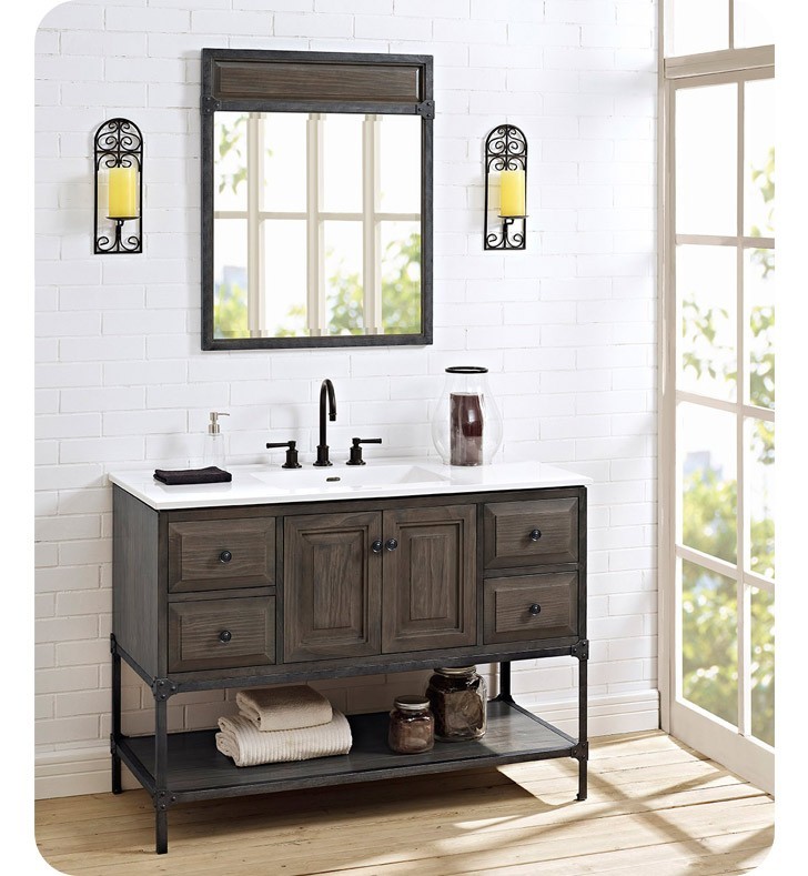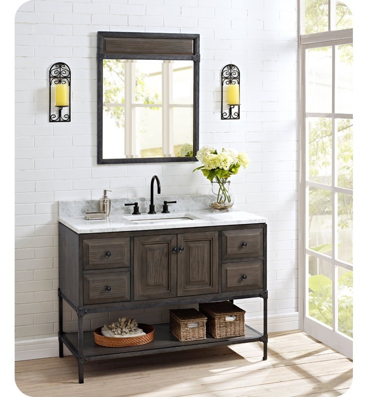 "Toledo blends a clean-lined profile with machine age details in a modern approach to bath décor. Decorative “rivets” on cabinet and mirror provide a chic, cutting edge industrial look. Highlighting the innate beauty of the wood is a sand blasted Driftwood Gray finish, perfectly complemented by Charcoal finished metal framework and antique brass finished hardware.