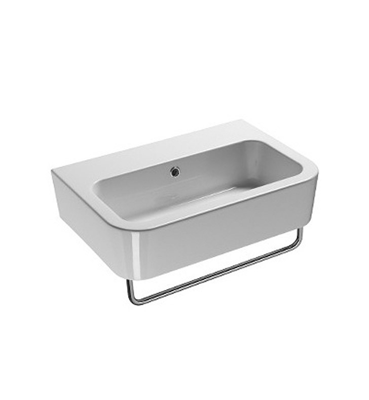 "GSI's Traccia no hole, one hole, or three hole ceramic bathroom sink is a ceramic sink that will compliment a contemporary style master bath. Imported from and manufactured in Italy by GSI, this vessel or wall mounted washbasin is a luxury option for your luxury personal bath. Match all your other white bathroom fixtures with this designer-quality white ceramic bathroom sink, made in quality ceramic. Does not include towel bar shown in picture."