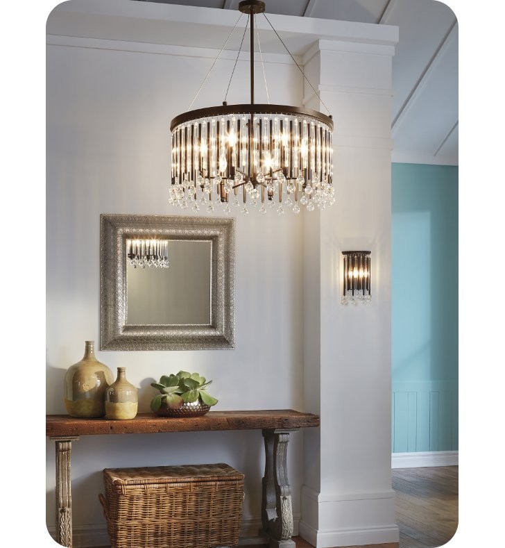 "Piper 2 Light Wall Sconce mixes modern with femininity with its delicate glass bead accents. Making this a focal point in any modern room is the linear detail in the clear glass and metal rods finished in Espresso."